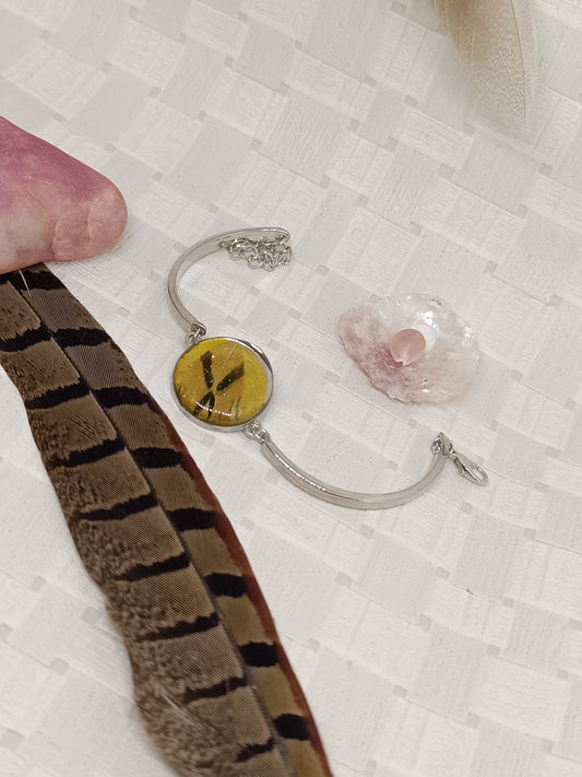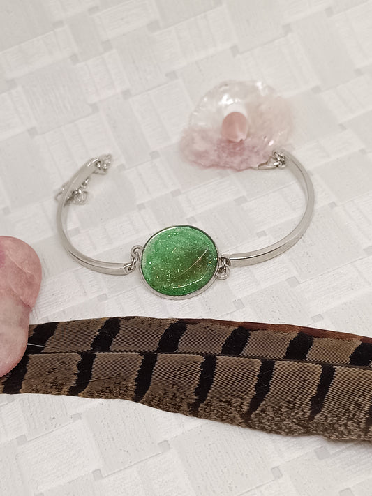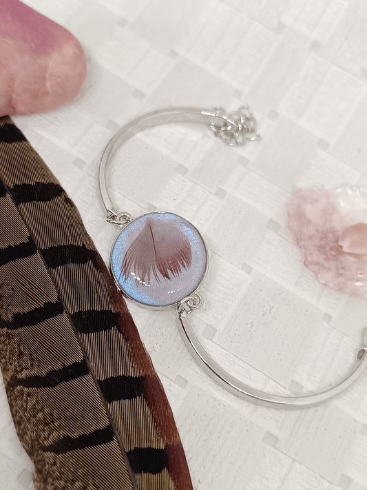 Bracelet argenté avec inclusion de plume Ce magnifique bracelet en métal argenté...
